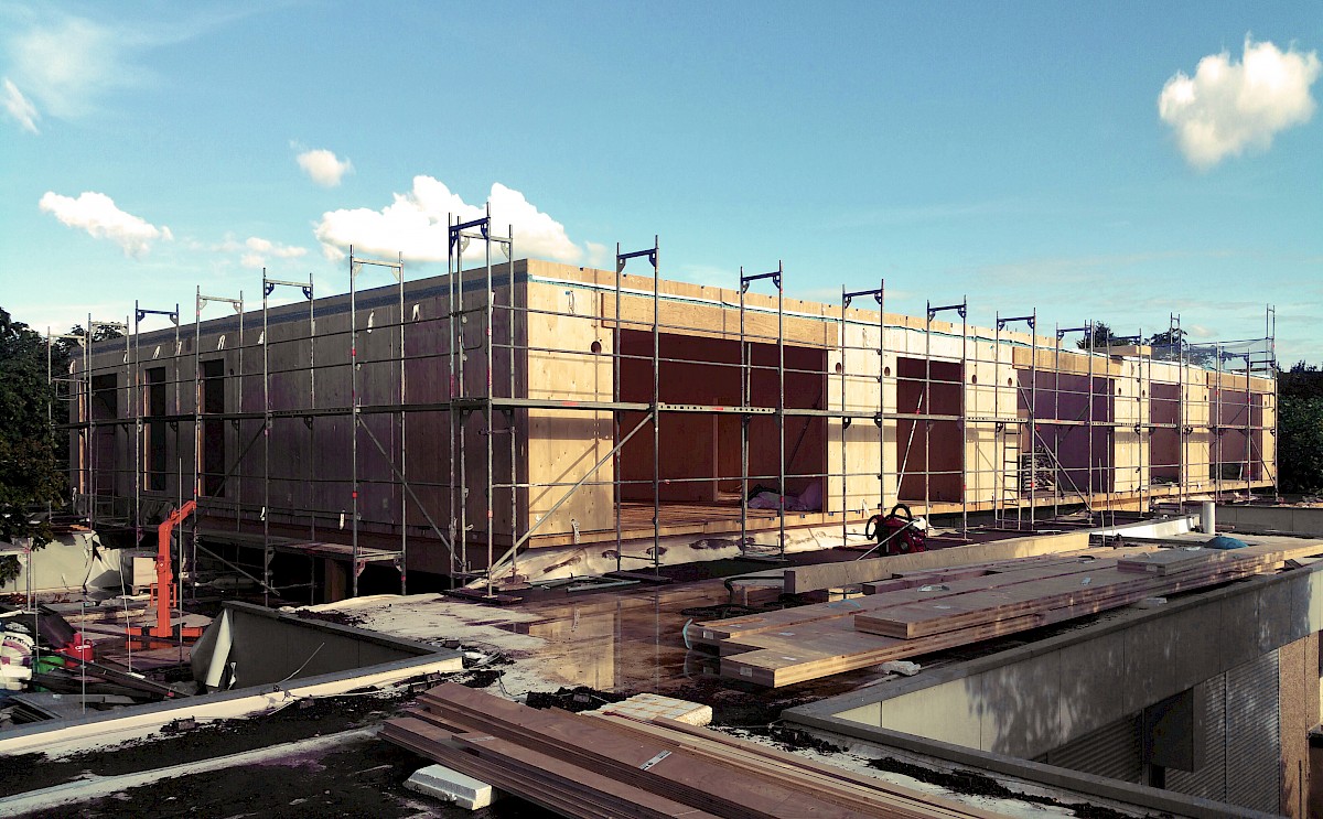 Rechtzeitig innerhalb der dreiwöchigen Ferienschließzeit am 16.08. wurde der Rohbau des dreigruppigen Kindergartens in Brettsperrholz Bauweise auf der vorhandenen eingeschossigen Caritas Kindertagesstätte Rastpfuhl errichtet und fertiggestellt.