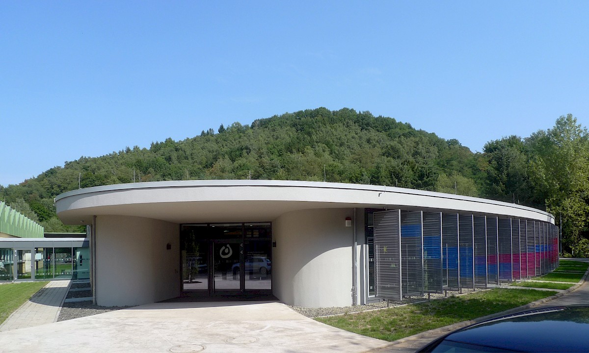 Der zweigeschossige Baukörper mit auskragendem Obergeschoss überzeugt durch ein klares Erscheinungsbild. Diese Klarheit setzt sich in der inneren Struktur fort, die auf einer rechteckigen Grundfläche um eine zentrale Halle entwickelt wurde.