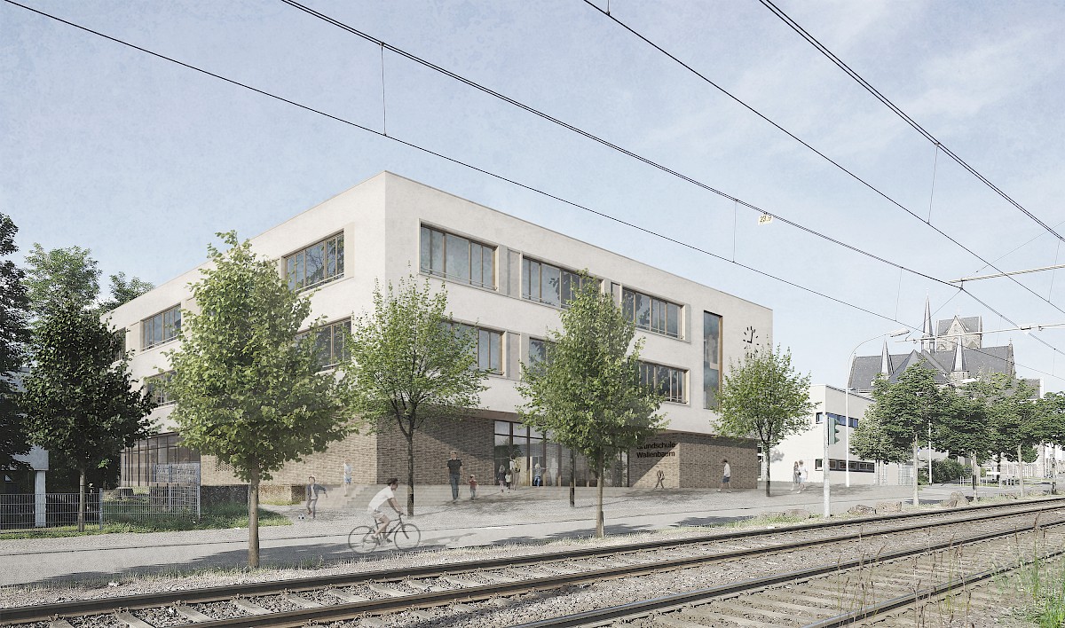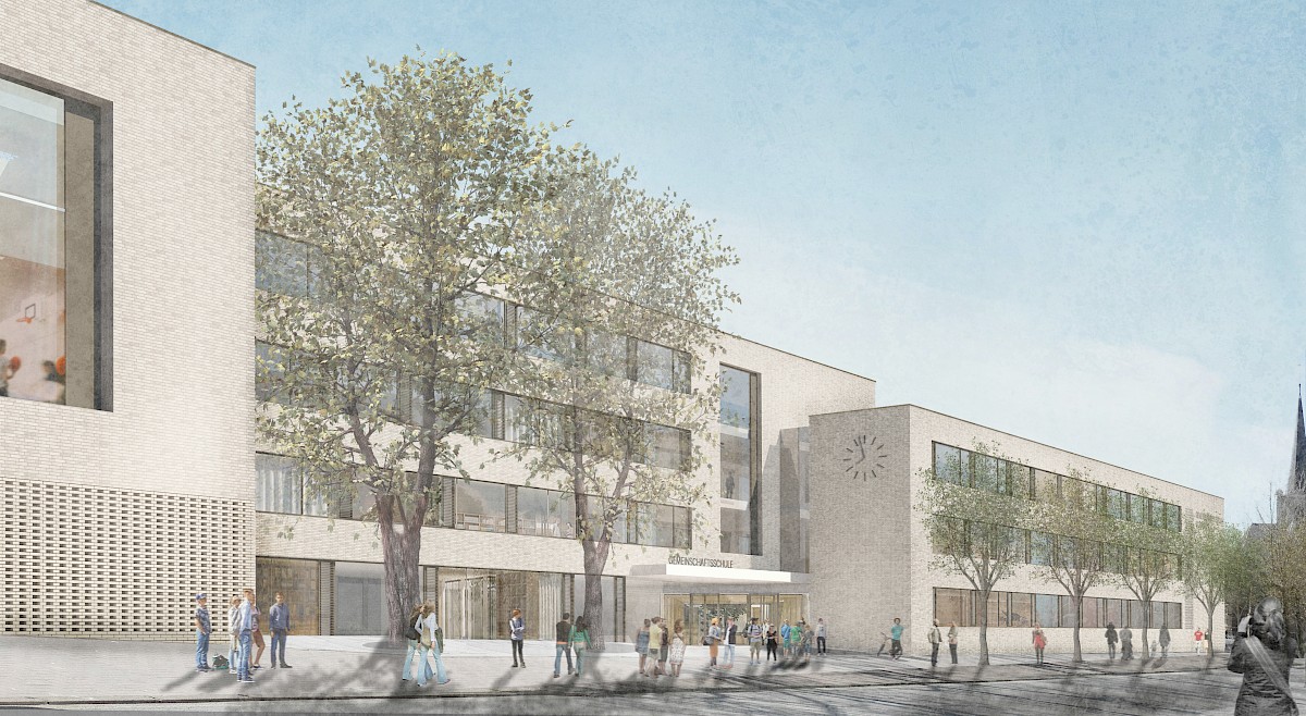 „Der Preisträger hat eine hervorragende Konzeption vorgelegt. Einerseits passt der geplante Neubau zum bestehenden Gebäude mit seiner Architektur der 50er-Jahre. Andererseits überzeugt er durch eine eigene klare, gut gegliederte, moderne Fassade. Den vorliegenden Planungen zufolge wäre es möglich, bei laufendem Schulbetrieb wirtschaftlich zu bauen. Der Schulhof würde in seiner aktuellen Größe erhalten bleiben. Auch der Baumbestand müsste kaum verändert werden.“