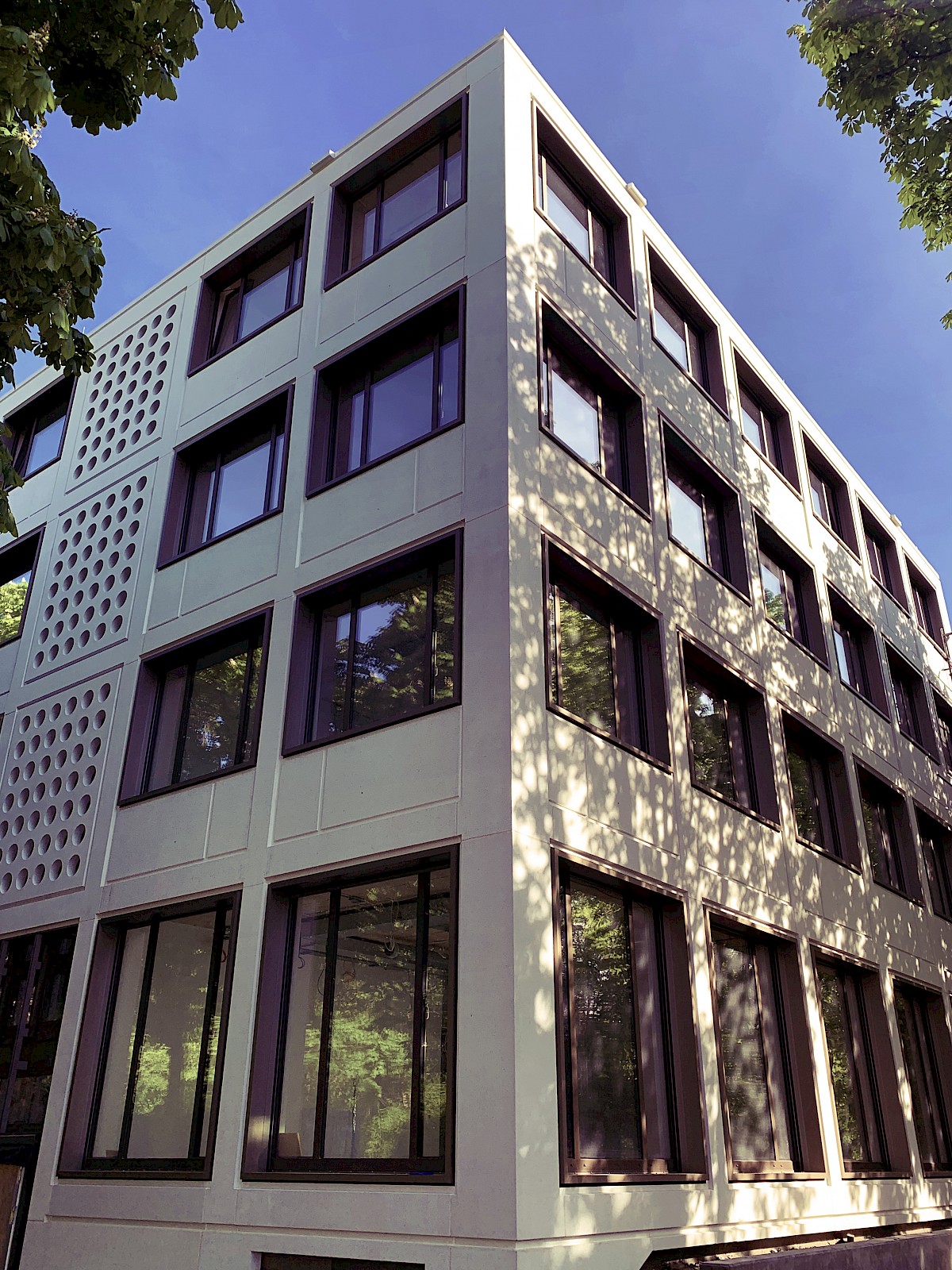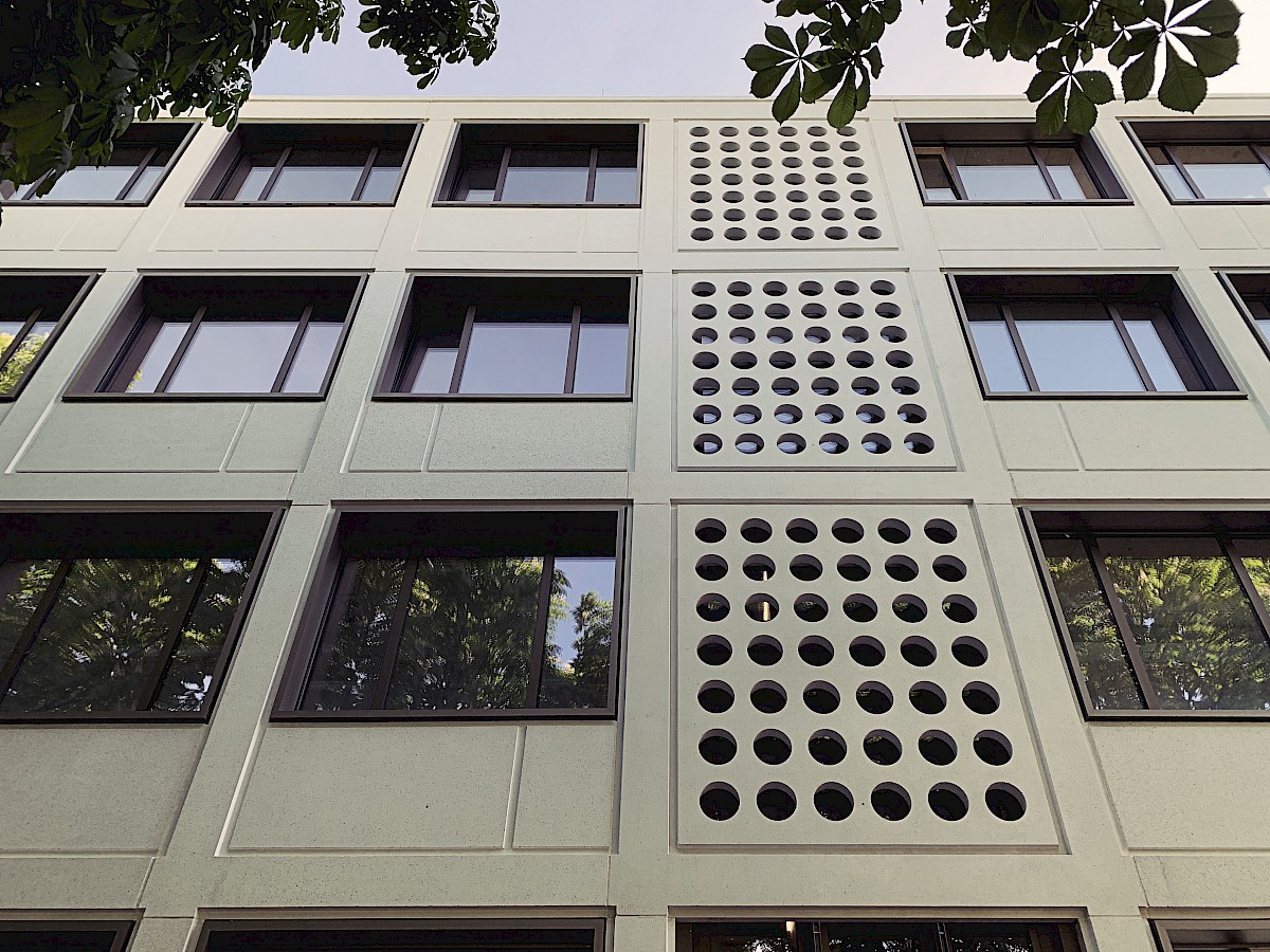 Der kompakte Neubau erweitert die bestehende Grundschule des Architekten Peter Paul Seeberger aus den 1950er-Jahren um dringend benötigte Räume für die Nachmittagsbetreuung, Verwaltung sowie eine Mensa. Er nimmt bewusst Bezüge zur baulichen Umgebung und dem Bestand auf und integriert sich sensibel in das bestehende Ensemble. Die Erschließung erfolgt über die ursprüngliche Eingangshalle und ein gemeinsam genutztes Foyer. Die Fassade aus gestrahltem Weißbeton interpretiert Gliederung und Rhythmus des Bestandsgebäudes in zeitgemäßer Form und fügt sich harmonisch in das Ensemble ein. Besonders berücksichtigt wurde der Erhalt wertvoller Baumbestände auf dem Grundstück.