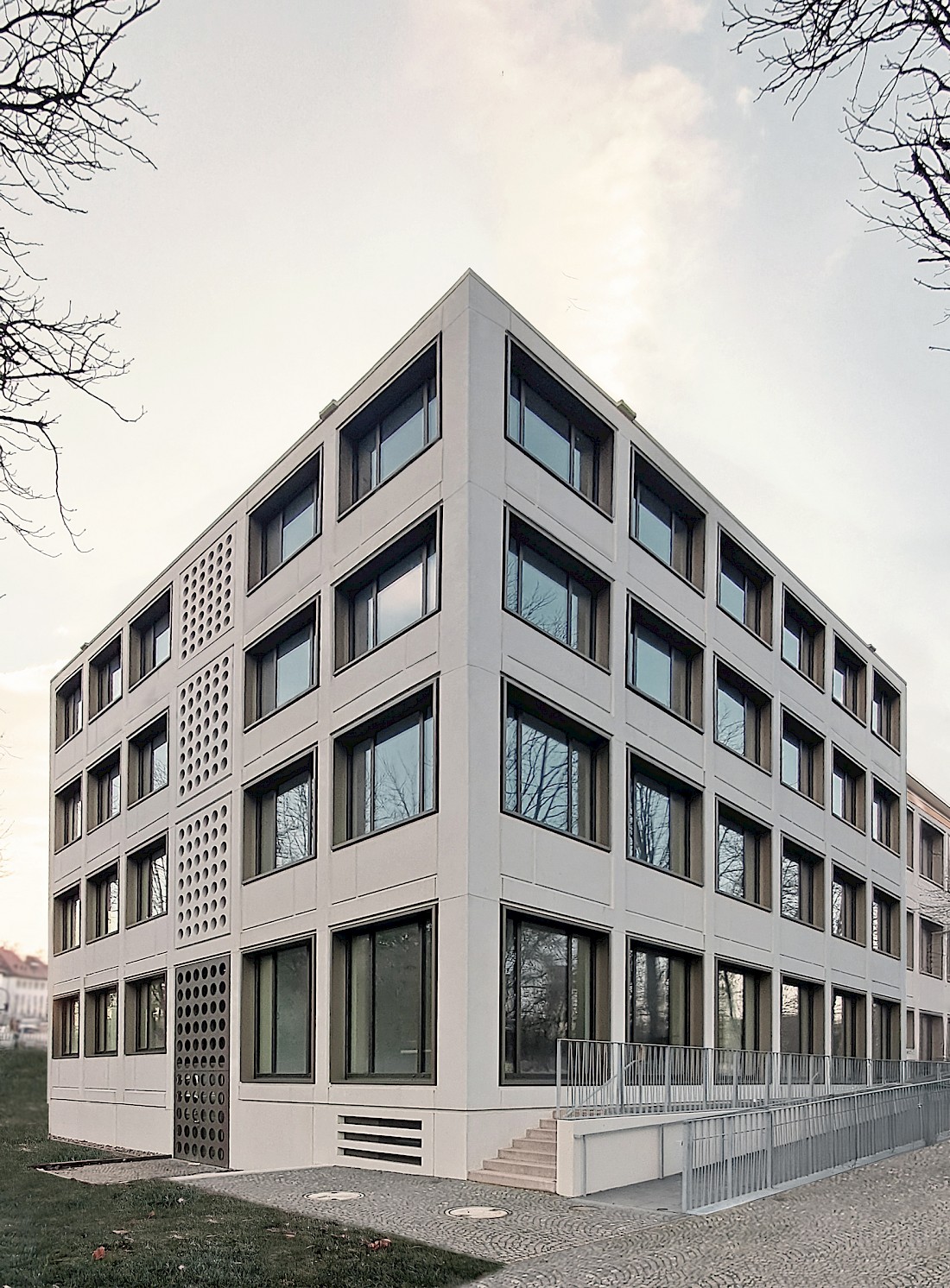 Der kompakte Neubau erweitert die bestehende Grundschule des Architekten Peter Paul Seeberger aus den 1950er-Jahren um dringend benötigte Räume für die Nachmittagsbetreuung, Verwaltung sowie eine Mensa. Er nimmt bewusst Bezüge zur baulichen Umgebung und dem Bestand auf und integriert sich sensibel in das bestehende Ensemble. Die Erschließung erfolgt über die ursprüngliche Eingangshalle und ein gemeinsam genutztes Foyer. Die Fassade aus gestrahltem Weißbeton interpretiert Gliederung und Rhythmus des Bestandsgebäudes in zeitgemäßer Form und fügt sich harmonisch in das Ensemble ein. Besonders berücksichtigt wurde der Erhalt wertvoller Baumbestände auf dem Grundstück.