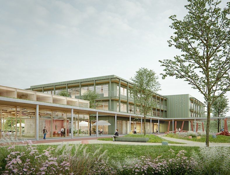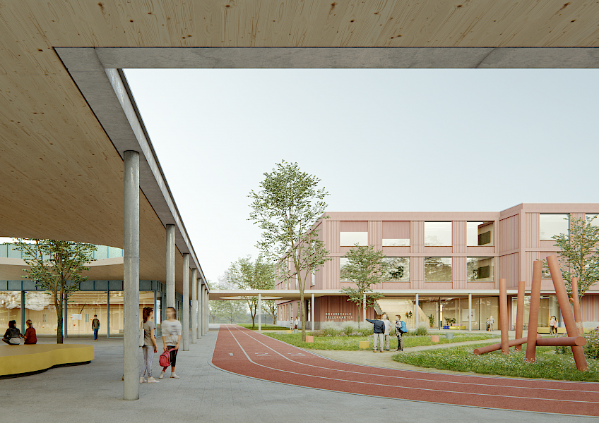 Der Entwurfsansatz für den Bildungscampus West versteht Schule als offenen, lebendigen und zukunftsweisenden Lern- und Lebensraum. Ziel ist die Schaffung eines Campus, der weit über die bloße Addition von Gebäuden hinausgeht und als zusammenhängendes Ensemble funktioniert – als Herzstück des Saarbrücker Westens, das Bildung, Gemeinschaft, Bewegung und Natur in Einklang bringt. Das Leitmotiv „Ein Campus – zwei Schulen – viele Begegnungen“ prägt die Konzeption: Jede Schule behält ihre Eigenständigkeit und einen geschützten Hofbereich, während Mensa, Sporthalle und Grünraum als verbindende Elemente Begegnung, Austausch und gemeinschaftliches Lernen fördern. So entsteht ein pädagogisch wertvoller Ort, der sowohl den individuellen Bedürfnissen als auch dem sozialen Miteinander gerecht wird. Der Campus signalisiert Offenheit, vermittelt Geborgenheit und verkörpert eine moderne, inklusive und nachhaltige Schullandschaft. Die Baukörper fügen sich selbstverständlich in die vorhandene Struktur ein. Die Grundschule im Norden orientiert sich an den Bestandsbauten. Im Osten definiert die Gemeinschaftsschule den Übergang zum Innovationscampus und setzt einen markanten städtebaulichen Akzent, der den Bildungscampus weithin sichtbar verankert. Ein großzügiges Freiraumband, durchfließt den Campus und integriert das Schulareal somit natürlich als Teil des städtischen Grünzugs. Die Sporthalle liegt bewusst im Süden, nahe den Außensportanlagen, um eine unkomplizierte Öffnung auch für außerschulische Nutzung gewährleisten zu können. Damit wird die Halle zum Bindeglied zwischen Campus und Stadtgesellschaft. Sie übernimmt zu dem eine wichtige Rolle in der Gewährleistung des Schallschutzes, da sie durch ihre Positionierung und Ausrichtung als Abschirmung der städtischen Lärmquellen vom Inneren des Schulareals dient. Die Höhenentwicklung respektiert die umliegende Bebauung: Drei Geschosse im Westen und vier Geschosse im SüdOsten schaffen eine harmonische Staffelung, wahren die Maßstäblichkeit und vermeiden harte Brüche