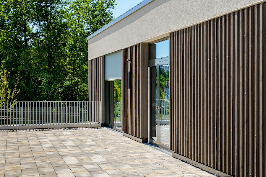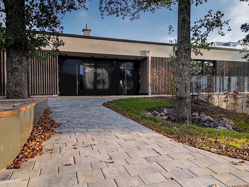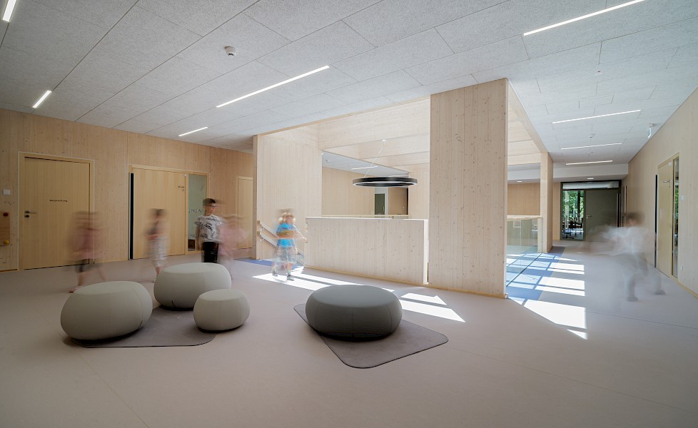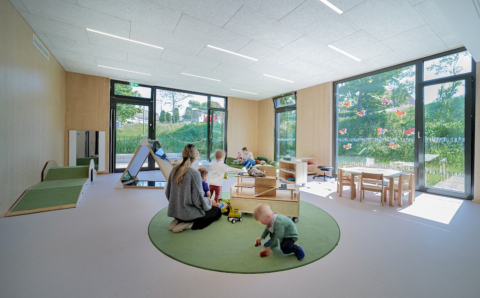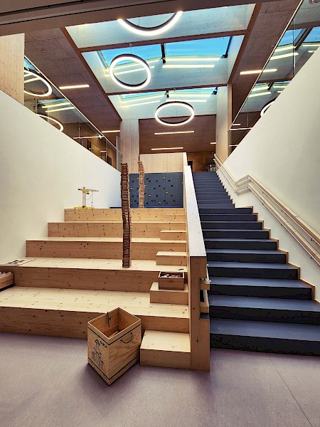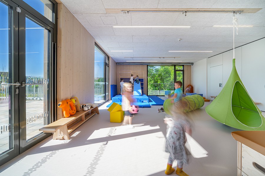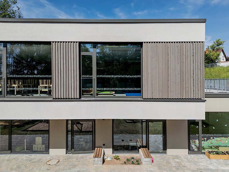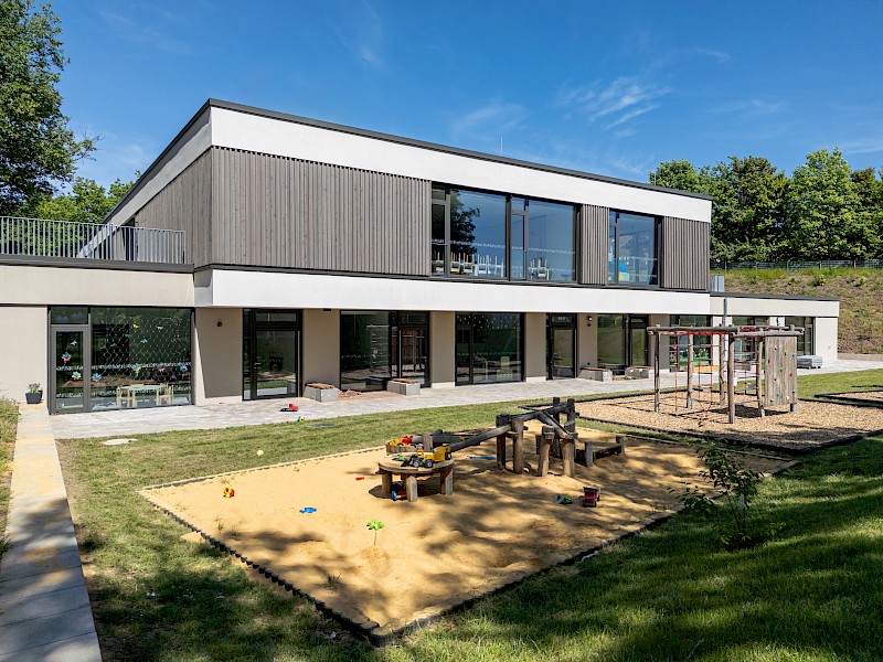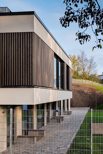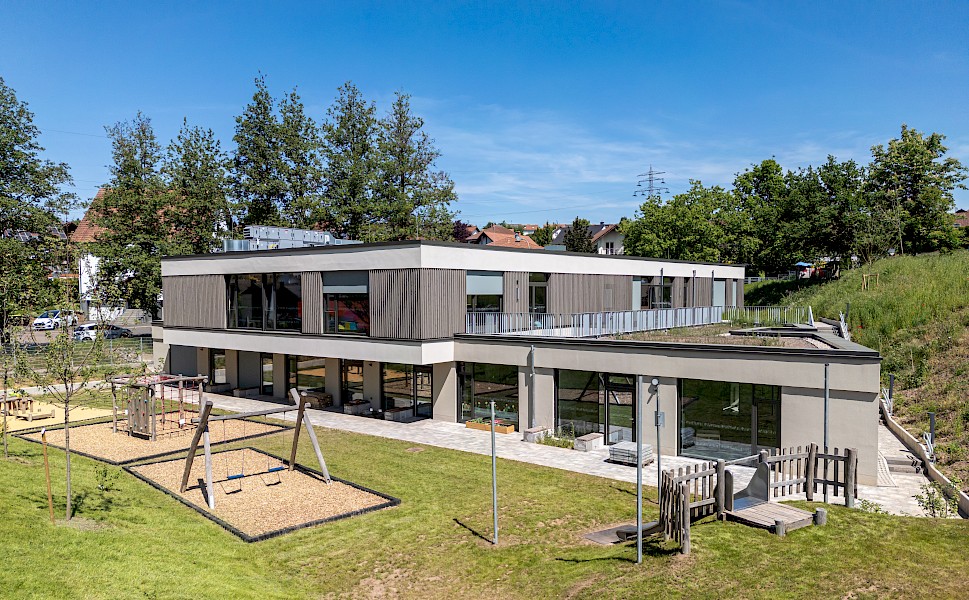 Ein in seiner Staffelung des Geländes anspruchsvolles Baufeld, eingebettet in eine heterogene städtebauliche Nachbarschaft und umgebenen von einer Bebauung, welche in Formensprache, Materialität und Maßstäblichkeit divergiert, setzen die Rahmenbedingungen für den konzeptionellen, städtebaulichen Lösungsansatz. Ein kompaktes, zweigeschossiges Konzept ermöglicht die Nutzung der verbleibenden Freiraumresourcen für vielfältige Angebote.