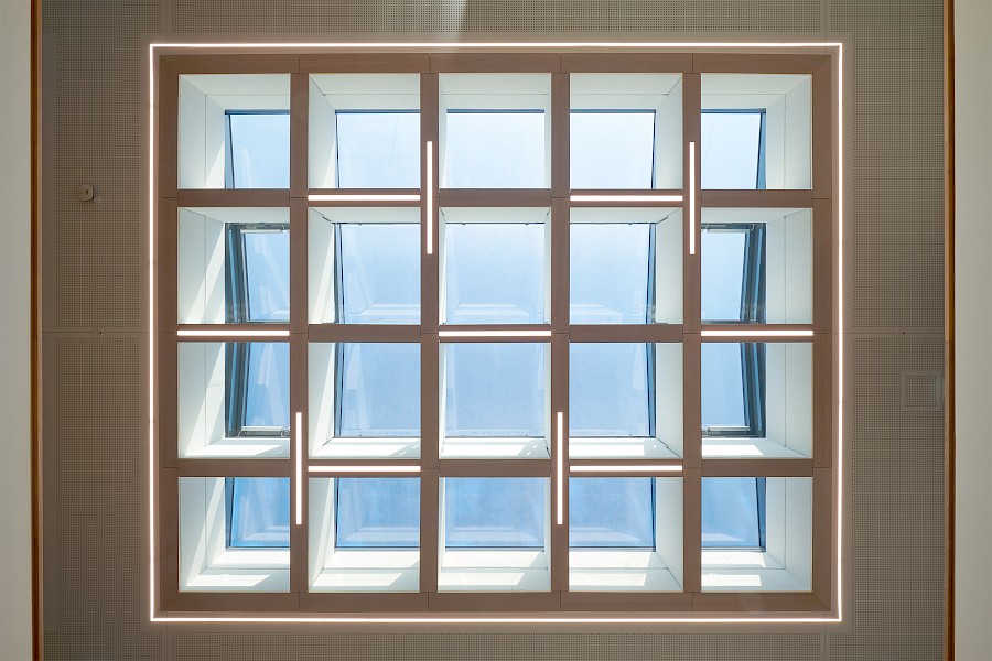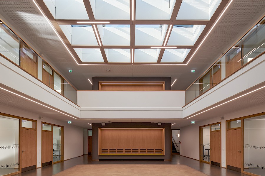 Das vorhandene Schulensemble in der Heinestraße aus den 60er Jahren wurde durch das Oberstufenzentrum Völklingen baulich erweitert. Der dreigeschossige Neubau wurde so adaptiv in die Topografie des Terrains positioniert, dass er auf der Eingangsseite zwei- und auf der Schulhofseite dreigeschossig in Erscheinung tritt. Der quaderförmige Neubau fügt sich in Ausrichtung und Proportion seiner Kubatur städtebaulich in den Bildungscampus ein. Das Grundstück fällt von Westen nach Osten und von Norden nach Süden um rund drei Meter ab. Diese Höhendifferenz wird zur Erschließung des Gebäudes auf zwei Ebenen genutzt.