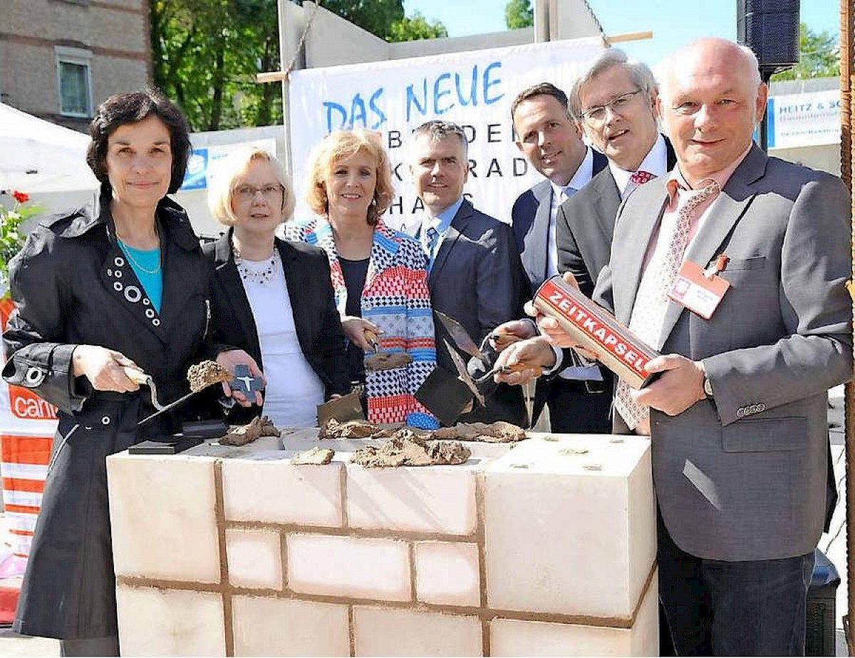 Sie legten den Grundstein für das Bruder-Konrad-Haus: (von links) Birgit Kugel, Direktorin des Diözesan-Caritasverbandes Trier, Ursula Spang, Vorsitzende des Caritasverbandes Saarbrücken und Umgebung, Oberbürgermeisterin Charlotte Britz, Caritasdirektor Michael Groß, Staatssekretär Stephan Kolling, Architekt Willi Latz und Wolfgang Höfner, Leiter des Bruder-Konrad-Hauses.