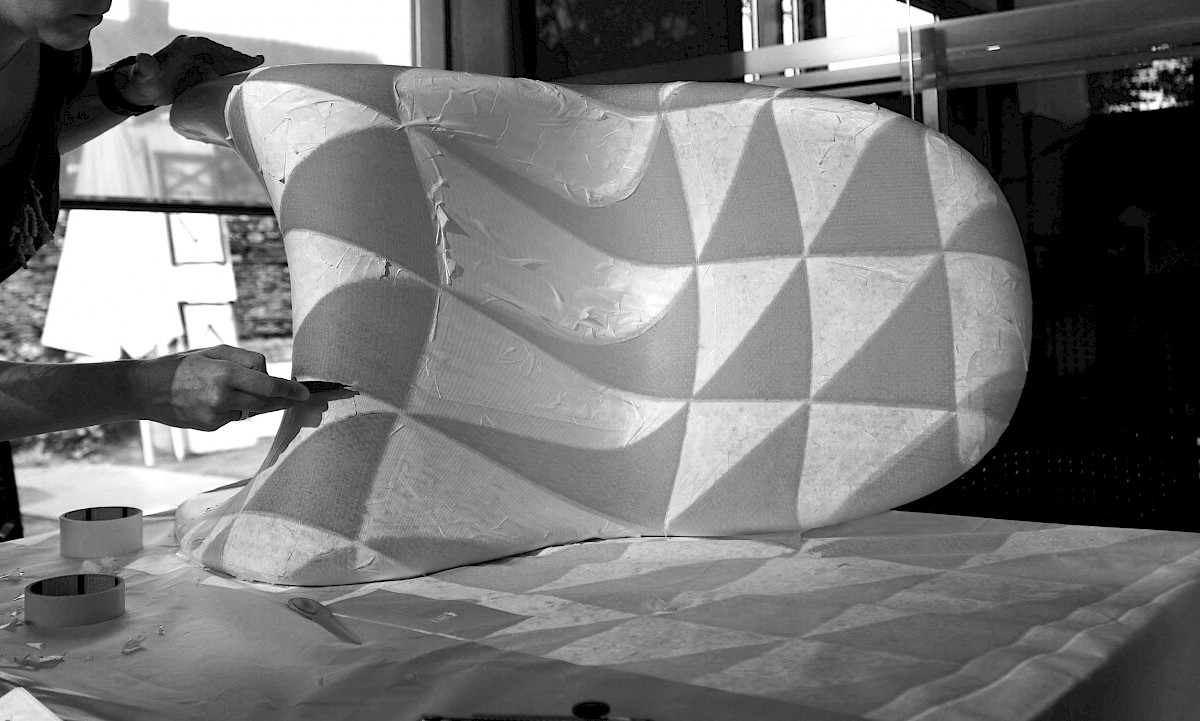 Unser Beitrag arbeitet mit der prägnanten und außergewöhnlichen Geometrie des Stuhlentwurfs von Verner Panton. Wir nutzten diese Geometrie zur Projektion einer Abstraktion des Holzdrucks der Künstlerin Astrid Latz aus dem Jahr 2013 mit dem Titel „Sieben im Quadrat“.