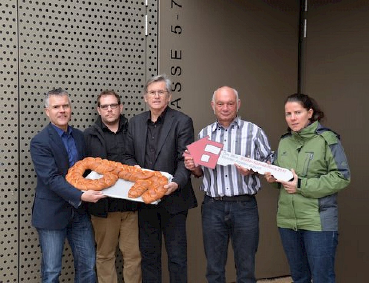 Heute fand die feierliche Einweihung der Kita in der Gisorstrasse in Riegelsberg statt. Statt einer obligatorischen Schlüsselübergabe wurde ein essbarer Hefeteigschlüssel an den Leiter der Kita Herrn Jakubik überreicht. Mit auf dem Bild sind Herr Bürgermeister Häusle, die Beigeordnete des Regionalverbandes Frau Morschette-Sarg sowie die Ministerin für Bildung und Kultur Frau Streichert-Cliveau.