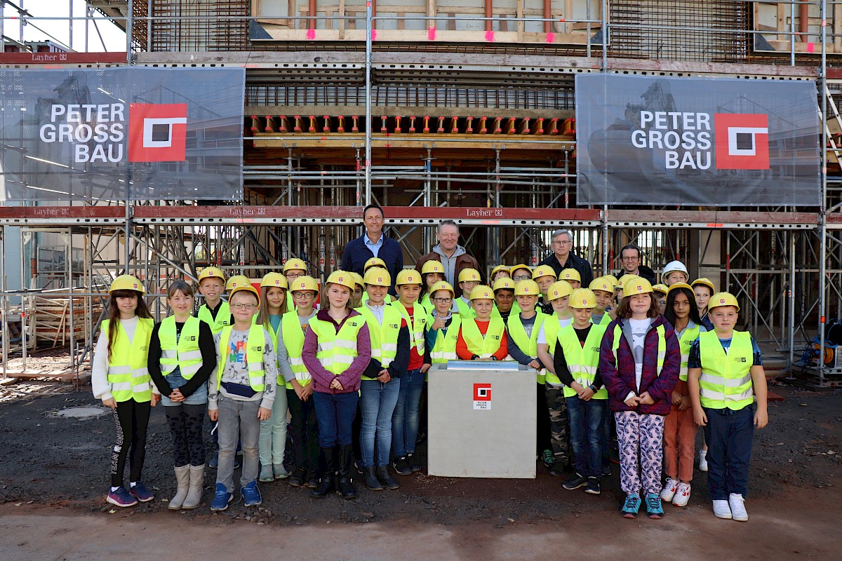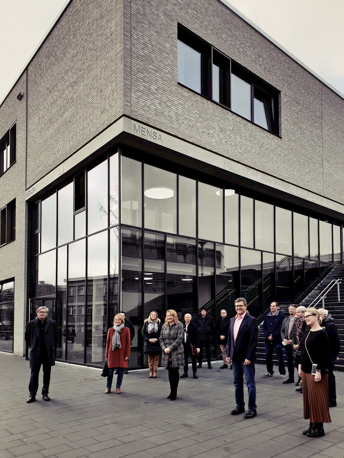 vordere Reihe von links: Ulrike Hahn (Schulleitung), Thomas Brück (Kulturdezernent), Charlotte Britz (Oberbürgermeisterin), Willi Latz (Architekt), Ulli Kayser (Bauleitung - nicht im Bild), Oliver Paulus (Leiter Pädagogik)
