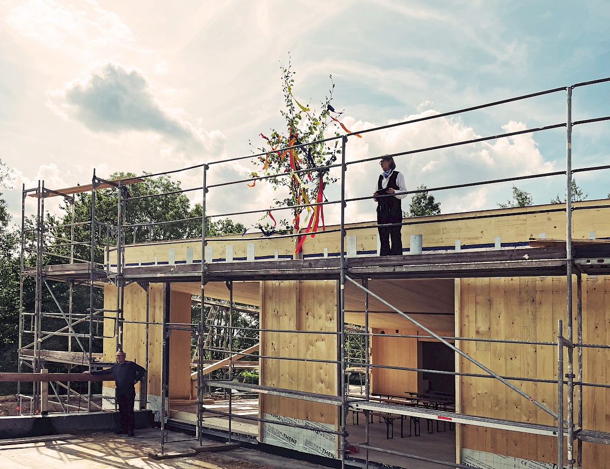 Rechtzeitig innerhalb der dreiwöchigen Ferienschließzeit am 16.08. wurde der Rohbau des dreigruppigen Kindergartens in Brettsperrholz Bauweise auf der vorhandenen eingeschossigen Caritas Kindertagesstätte Rastpfuhl errichtet und fertiggestellt.