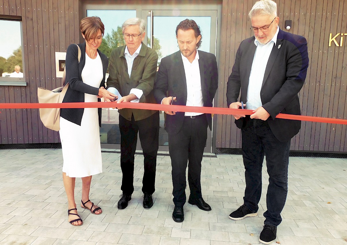 Zur feierlichen Eröffnung der KiTa Seepferdchen in Bous am 23.08.2024 wird das rote Band zeremoniell durch Claudia Thiel (arus), Willi Latz (arus), Daniel Treser (Kultusministerium) und Bürgermeister Stefan Louis zerschnitten (v.l.n.r.).