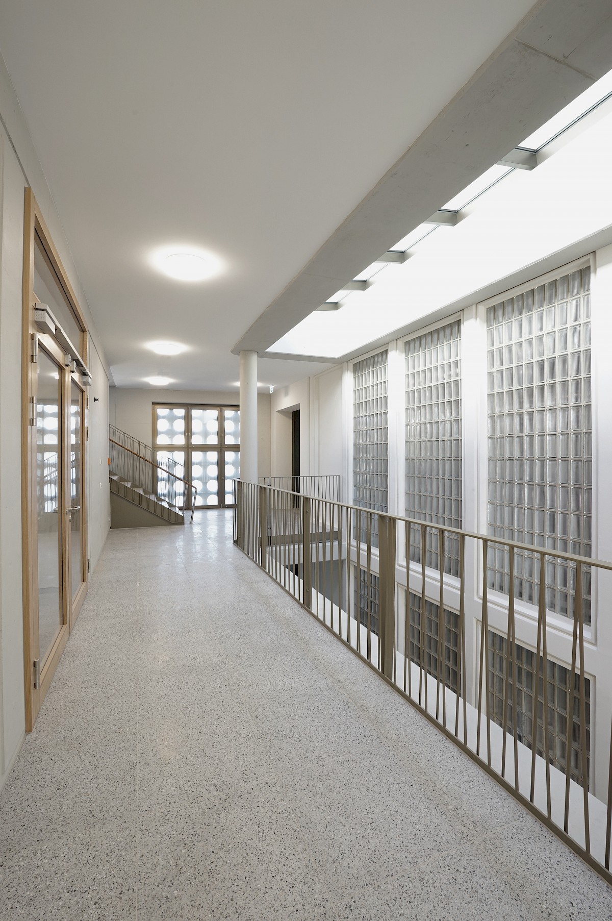 Der kompakte Neubau erweitert die bestehende Grundschule des Architekten Peter Paul Seeberger aus den 1950er-Jahren um dringend benötigte Räume für die Nachmittagsbetreuung, Verwaltung sowie eine Mensa. Er nimmt bewusst Bezüge zur baulichen Umgebung und dem Bestand auf und integriert sich sensibel in das bestehende Ensemble. Die Erschließung erfolgt über die ursprüngliche Eingangshalle und ein gemeinsam genutztes Foyer. Die Fassade aus gestrahltem Weißbeton interpretiert Gliederung und Rhythmus des Bestandsgebäudes in zeitgemäßer Form und fügt sich harmonisch in das Ensemble ein. Besonders berücksichtigt wurde der Erhalt wertvoller Baumbestände auf dem Grundstück.