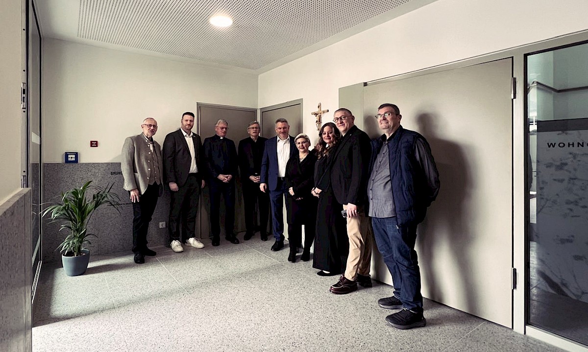 Mit einer feierlichen Einsegnung wurde das neue Miteinanderhaus in Dudweiler offiziell seiner Bestimmung übergeben. Zahlreiche Gäste aus Kirche, Politik sowie Projektbeteiligten nahmen an der Veranstaltung teil. (auf dem Bild u.a. Generalvikar Dr. Ulrich Graf von Plettenberg, Diakoniepfarrer Matthias Ewelt, Dezernat für Wirtschaft, Soziales und Digitalisierung - Beigeordneter Tobias Raab, Administration der TKS gGmbH: Caritasdirektor Michael Schley und Geschäftsführer Oliver Kremp-Mohr, die Leitung des Hauses Karina Abarti-Emmerich und Diana Theobald sowie Mitglieder des Caritasrates und Vertreter der Planungsbüros).